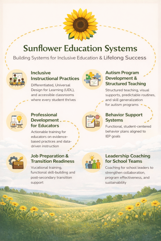 Sunflower Education Systems exists to strengthen schools by designing inclusive, structured, and sustainable educational systems that empower educators, support diverse learners, and prepare students for lifelong independence and success.